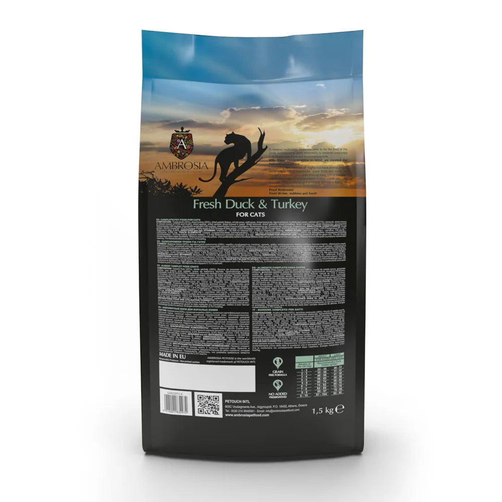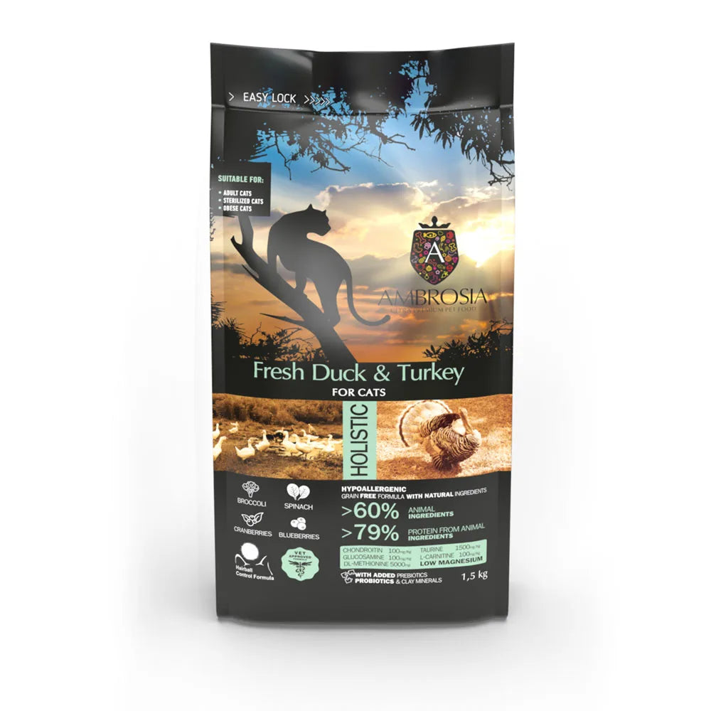 AMBROSIA Light Świeża kaczka i indyk 5kg dla kotów dorosłych, seniorów, kotów sterylizowanych i z nadwagą5214001832989