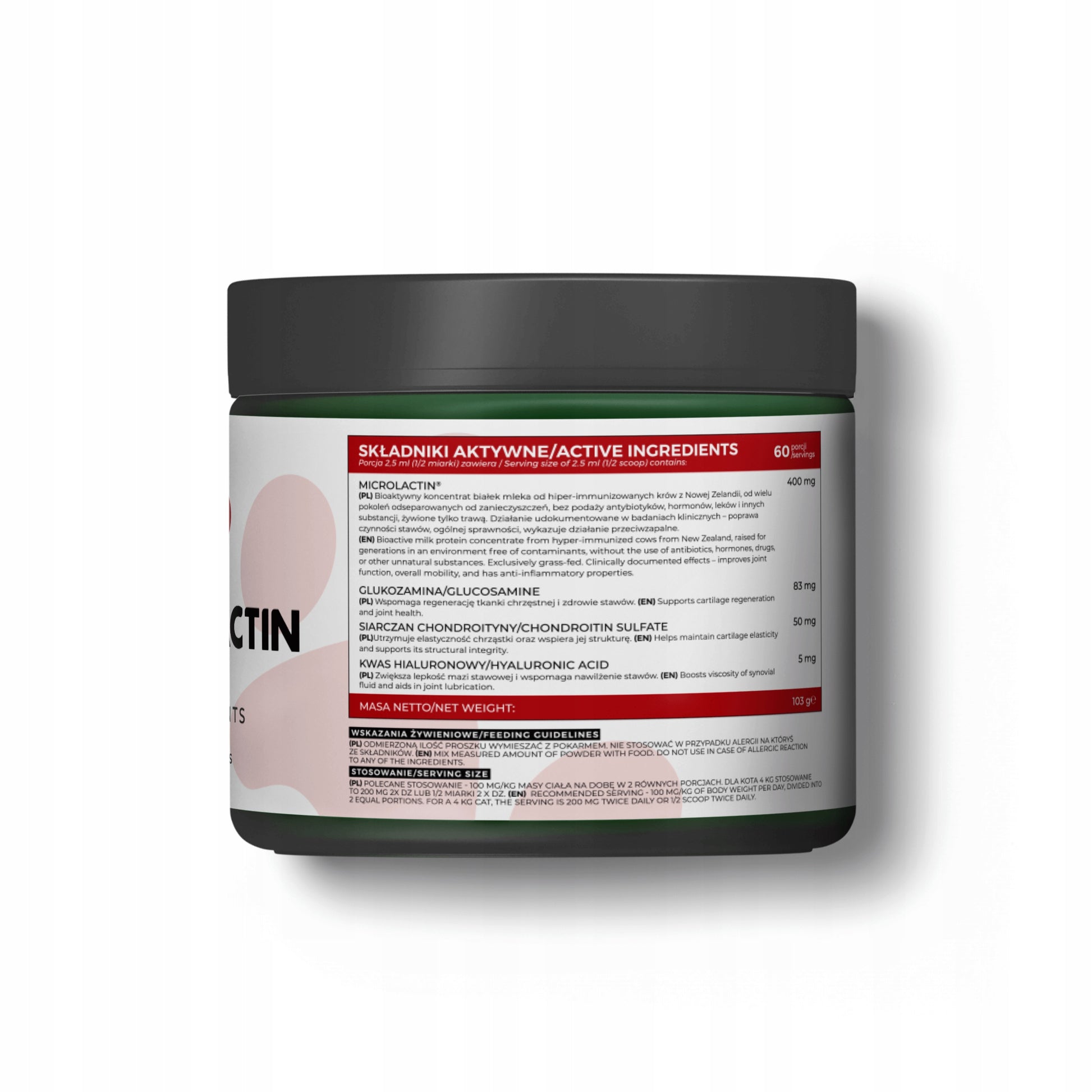 Sekret skuteczności suplementu tkwi w MicroLactin® – naturalnym koncentracie białek mleka pochodzących od krów hyperimmunizowanych w Nowej Zelandii. Ten składnik działa przeciwzapalnie, ograniczając migrację neutrofili – komórek odpowiedzialnych za mikrostany zapalne, które uszkadzają tkanki stawowe. Dzięki temu nie maskuje objawów, ale działa u źródła problemu, wspierając realną poprawę mobilności. W połączeniu z glukozaminą, chondroityną i kwasem hialuronowym suplement odbudowuje i nawilża chrząstkę, co sprzyja utrzymaniu elastyczności stawów. Wygodna forma proszku z miarką umożliwia łatwe podawanie wraz z karmą i wysoką przyswajalność składników.