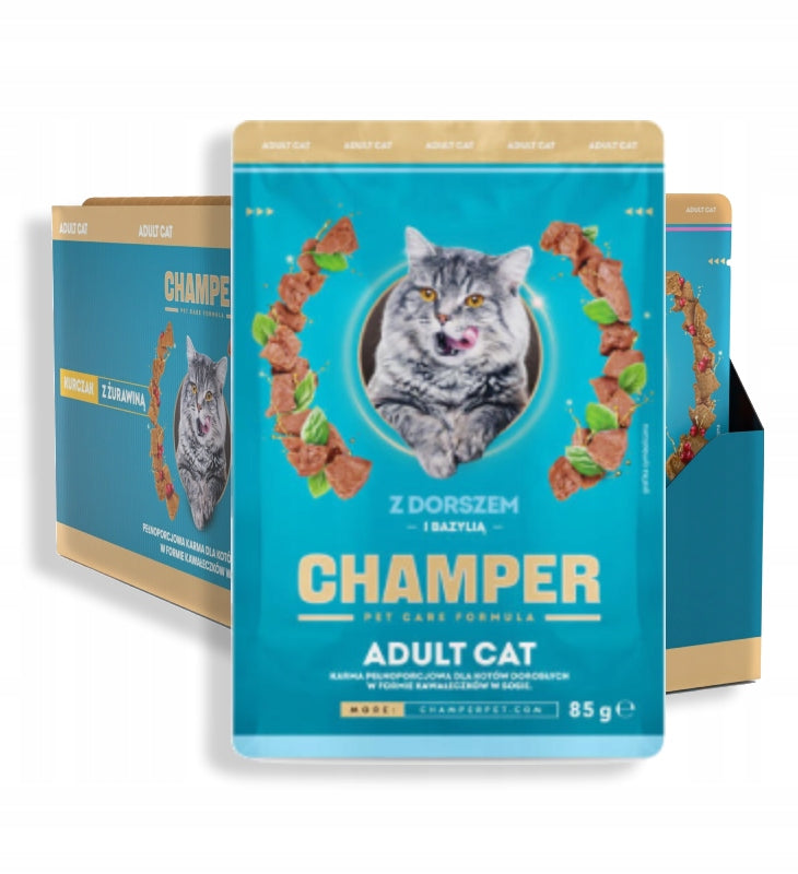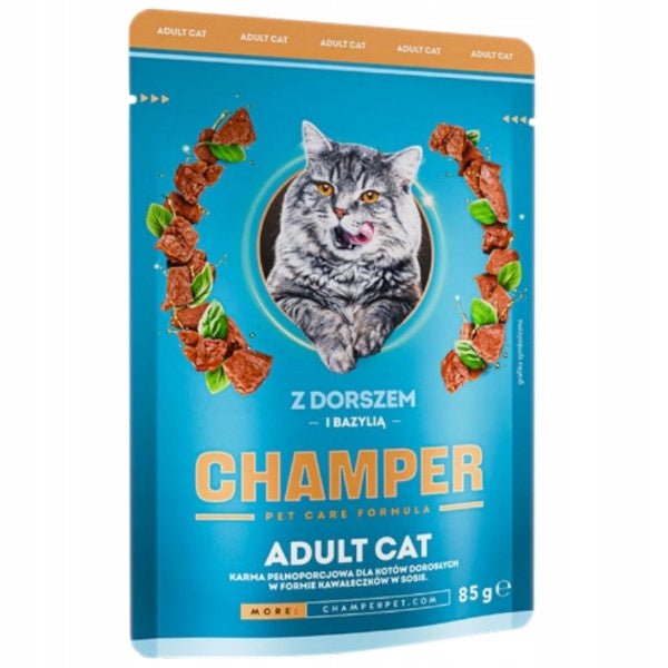CHAMPER Dorsz i bazylia w sosie 85g karma mokra dla kotów dorosłych
