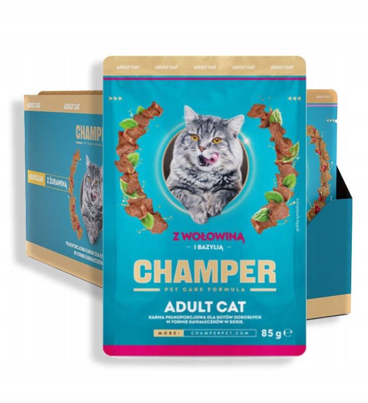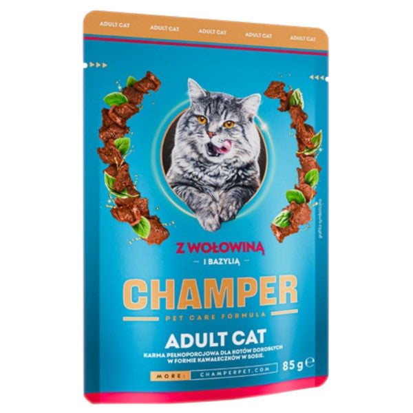 CHAMPER Wołowina i bazylia w sosie 85g karma mokra dla kotów dorosłych