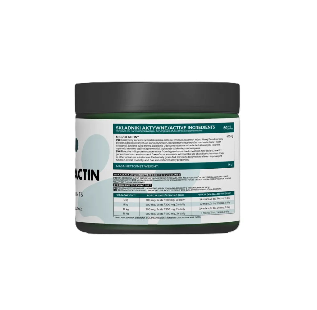 ANIMALACTIN STAWY dla małych psów to specjalistyczny suplement diety w proszku, stworzony z myślą o delikatnych rasach małych i miniaturowych. Jego głównym składnikiem jest MicroLactin® – bioaktywny koncentrat białek mleka krów karmionych naturalnie w Nowej Zelandii. Dzięki działaniu przeciwzapalnemu wspiera zdrowie stawów, chrząstki i kości, ograniczając mikrostany zapalne u źródła problemu. Regularne stosowanie sprzyja poprawie mobilności, zmniejsza sztywność stawów i pozwala psom cieszyć się większą swobodą ruchu każdego dnia. To rozwiązanie stworzone z myślą o psach starszych, aktywnych i predysponowanych do problemów ortopedycznych.
