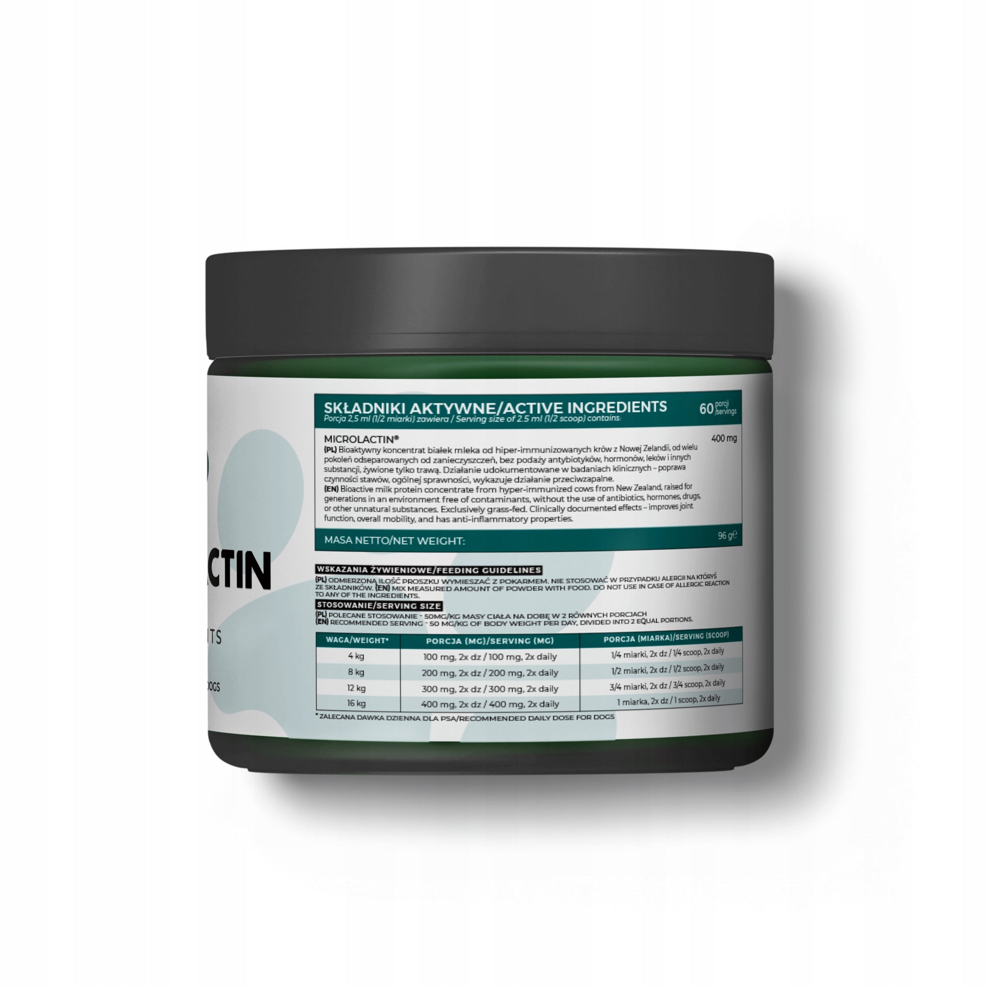 Unikalność ANIMALACTIN STAWY polega na prostym, ale skutecznym składzie opartym wyłącznie na MicroLactin®. Ten składnik ogranicza migrację neutrofili – komórek odpowiedzialnych za stany zapalne – dzięki czemu nie maskuje objawów, ale realnie wpływa na źródło problemu. Oprócz poprawy kondycji stawów, MicroLactin® wspiera naturalną odporność organizmu oraz ochronę tkanek. Preparat dostępny jest w wygodnej formie proszku z miarką, co ułatwia podanie i sprawia, że suplement jest dobrze akceptowany nawet przez wybredne psy małych ras.