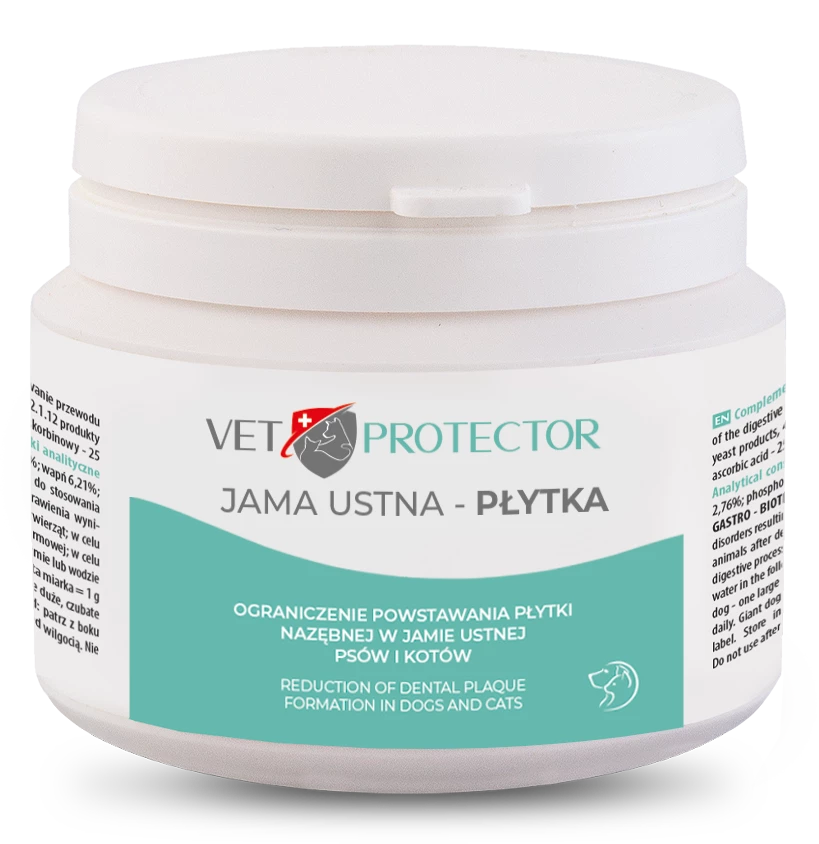VET PROTECTOR® JAMA USTNA – PŁYTKA zapobiega odkładaniu się płytki nazębnej, przy codziennym stosowaniu znacznie ogranicza odkładanie się kamienia nazębnego, redukuje stany zapalne i krwawienie.