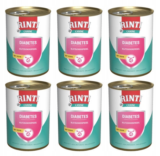 Rinti Canine Diabetes, pełnoporcjowy pokarm dietetyczny dla psów cierpiących na cukrzycę dla regulowania poziomu cukru we krwi oraz zredukowania nadwagi psa. Duża zawartość błonnika w pokarmie redukuje wahania poziomu cukru we krwi. Niska zawartość węglowodanów powoduje szybsze uwalnianie glukozy i w połączeniu z niską zawartością tłuszczu powoduje, że pokarm ten przyczynia się do zredukowania nadwagi psa.