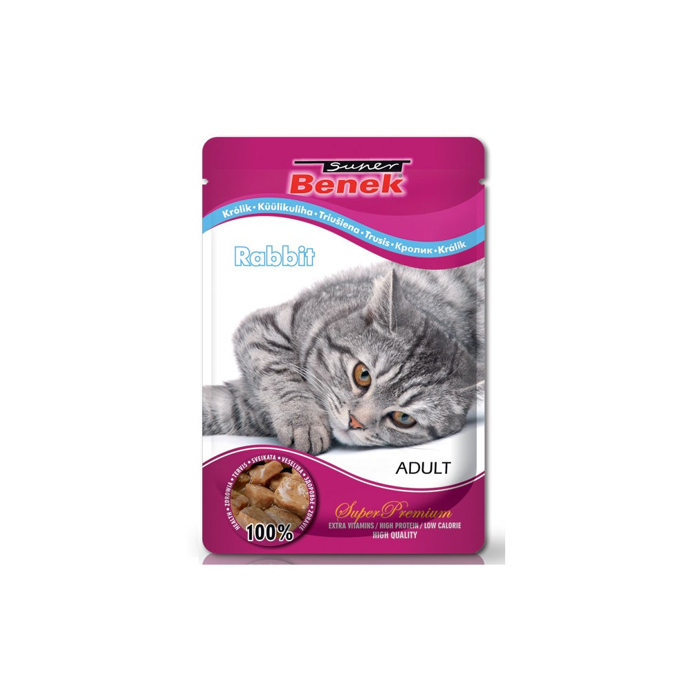 Pełnoporcjowa karma dla dorosłych kotów zawierająca delikatne mięsne kawałki z królika w aromatycznym sosie. Karma dla kotów Super Benek w saszetkach to linia Super Premium opracowana przez kompetentny zespół specjalistów oraz entuzjastów kotów. Atutem linii pokarmowej Super Benek jest wykorzystanie w procesie produkcyjnym składników tylko najwyższej jakości oraz zastosowanie dodatków sugerowanych przez naukowców jako pożądane na podstawie najnowszych badań. Karma jest bogatym źródłem witamin, soli mineralnych oraz składników odżywczych.