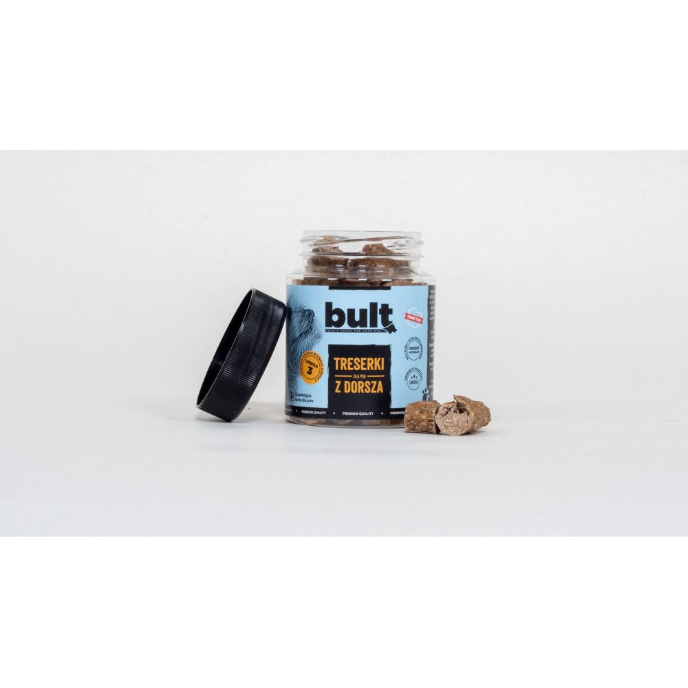 Z treserkami od bult wyruszysz w prawdziwą morską przygodę… na lądzie. Każda treserka z dorsza to suszona przekąska, którą pozbawiliśmy nadmiaru wody w specjalnym procesie przetwarzania. Podkręciliśmy w ten sposób jej zapach, dzięki czemu potrzeba tylko kilku sekund, aby poczuć się jak nad morzem. Jeśli Twój pies uwielbia taplać się w rzekach, jeziorach i strumieniach, kąsając za ogon napotkane ryby, treserki z dorsza na 100% zaspokoją jego dziką naturę łowcy. Obok tego aromatu nie da się przejść obojętnie.