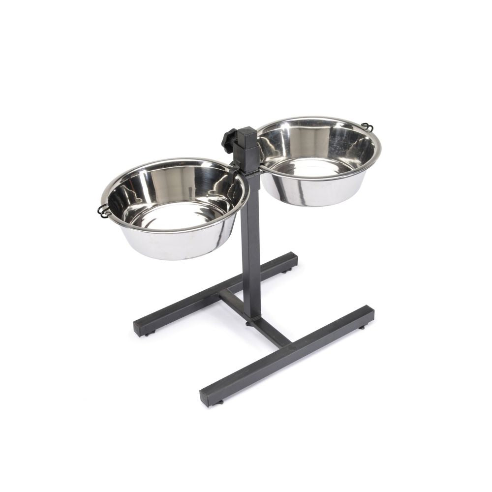 Klasyczne miski metalowe na stojaku regulowanym do podawania pokarmu. Wykonane z metalu - niezwykle wytrzymałe i łatwe w czyszczeniu. Są, trwałe i higieniczne. Wysokiej jakości, mocne i ciężkie. Regulacja wysokości umożliwia małym i dużym psom jedzenie w wygodniejszej i zdrowszej pozycji. Sprytne zapięcie misek gwarantuje doskonałą stabilność misek i zapobiega stukaniu.