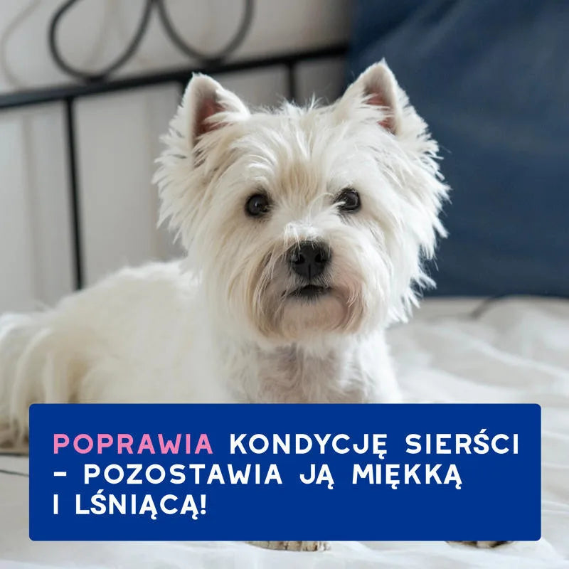 Nawilża i odżywia sierść, nadając jej miękkość i blask