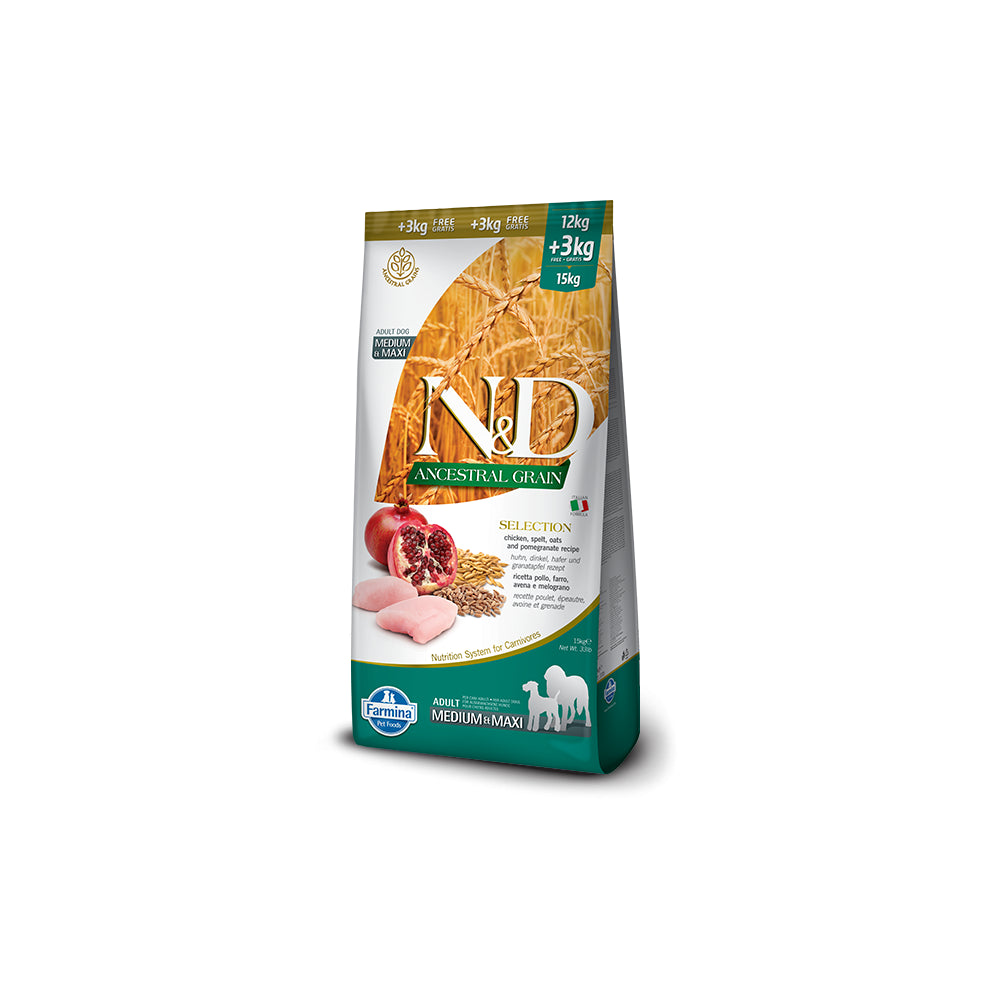 kurczak bez kości (20%), dehydratyzowane białko z kurczaka (20%), orkisz (12%), owies (owies zwyczajny) (12%), tłuszcz z kurczaka, dehydratyzowane białko ze śledzia, suszona pulpa buraczana, olej z ryb (ze śledzia), suszona marchew, mączka z lucerny, inulina z cykorii, fruktooligosacharydy, ekstrakt z drożdży (źródło mannooligosacharydów), suszony owoc granatu (0.5%), suszony szpinak, łuski i nasiona babki płesznik, chlorek sodu, suszone drożdże piwne, kurkuma, wyciąg z aloesu, glukozamina, siarczan chondroityny.