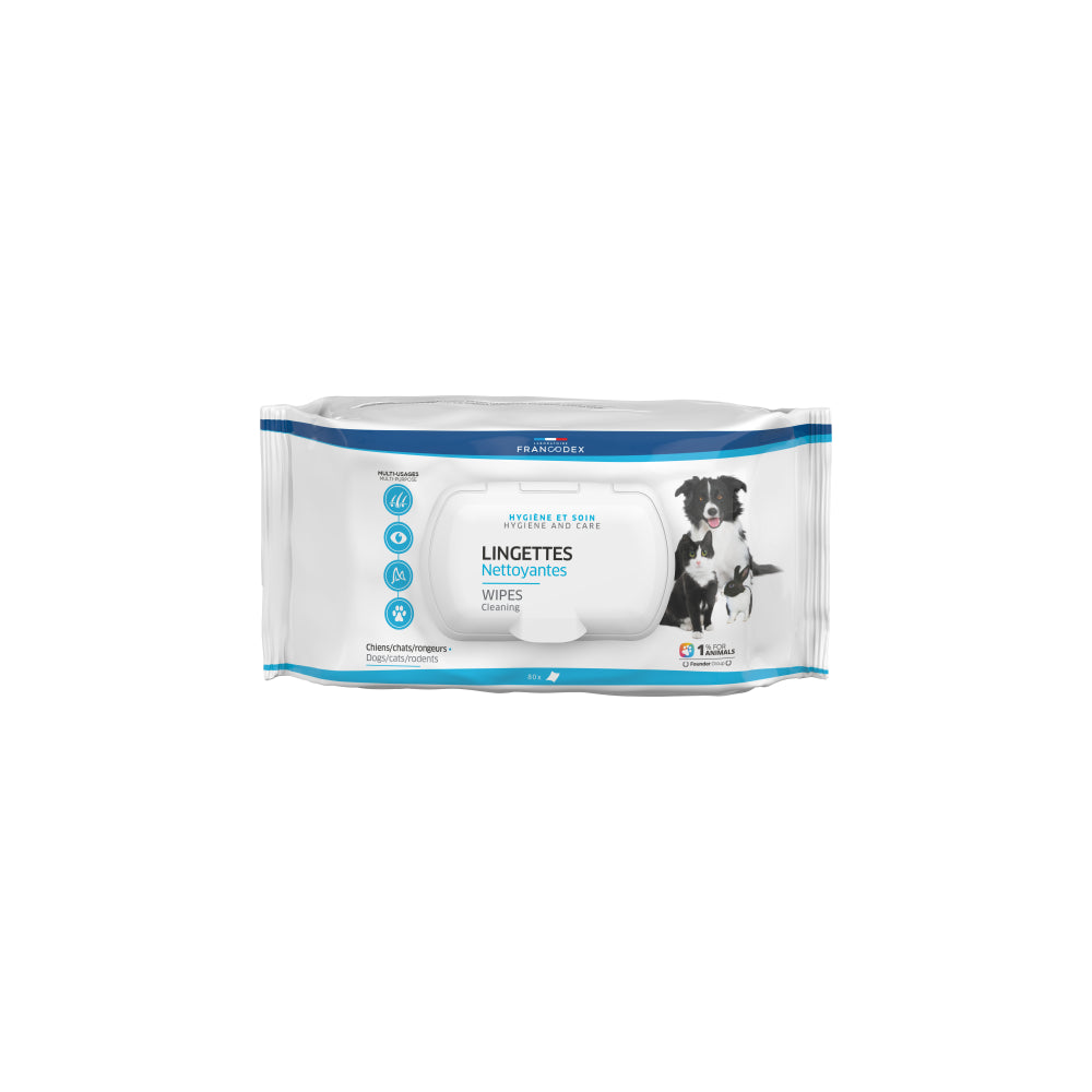 Jednorazowe chusteczki psów i kotów Francodex to sposób na utrzymanie higieny pomiędzy kąpielami. Chusteczki są bezwonne i posiadają neutralne dla zwierząt pH, dzięki czemu delikatnie usuwają wszelkie zanieczyszczenia, nie powodując przy tym podrażnień.