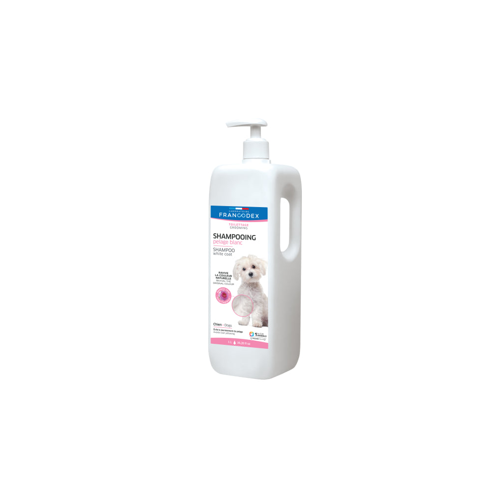 Dbanie o białą sierść u psa może być dużym wyzwaniem dla opiekuna. Specjalnie opracowana formuła szamponu Francodex wpływa bezpośrednio na pigmentację sierści zwierzęcia. Aktywne substancje ożywiają kolor poprzez oddziaływanie na melaninę zawartą w sierści i pogłębiają jej naturalny odcień. Sierść staje się błyszcząca dzięki obecnej w szamponie emulsji silikonowej.