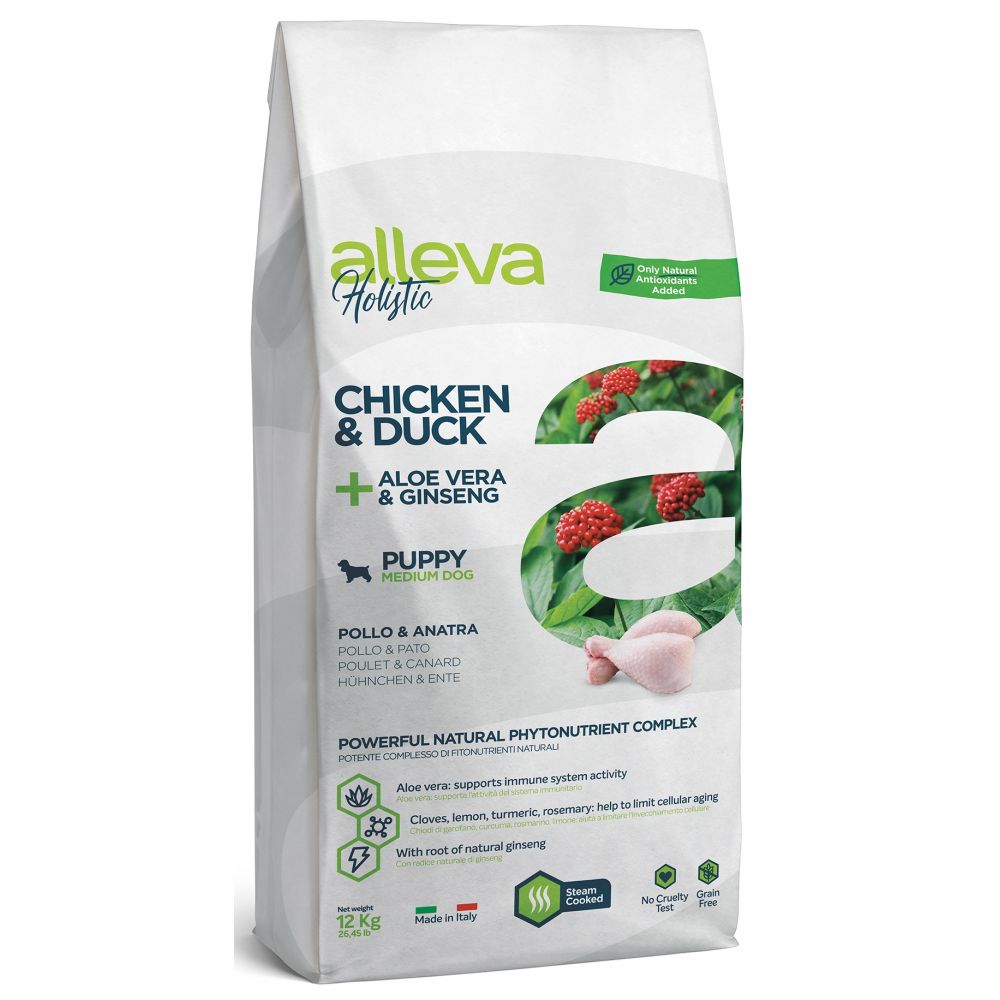 Skład: Suszony kurczak (40%), świeży kurczak bez kości (20%), dehydratyzowana kaczka (10%), słodki ziemniak, tłuszcz kurczaka, skrobia grochowa, olej rybi, wątroba kurczaka, korzeń cykorii (źródło inuliny i fruktooligosacharydów), włókno grochu, babka płesznik, suszone dezaktywowane drożdże (źródło mannanooligosacharydów), chrząstka kurczaka (źródło glukozaminy i chondroityny), węglan potasu, aloes (Aloe vera) (0,10%), korzeń żeń-szenia (Panax ginseng) (0,10%), rozmaryn, kurkuma, goździki, cytryna (Rosmarinus officinalis, Curcuma longa, Eugenia caryophyllus, Citrus sp.) (0,05%), sok z juki.