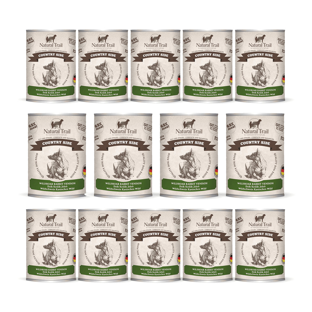 Dzik 35%, wywar 28,8%, królik 15%, jeleń 15%, gruszka 3%, czerwona borówka 2%, minerały 1%, olej z łososia 0,1%, zioła 0,1%.