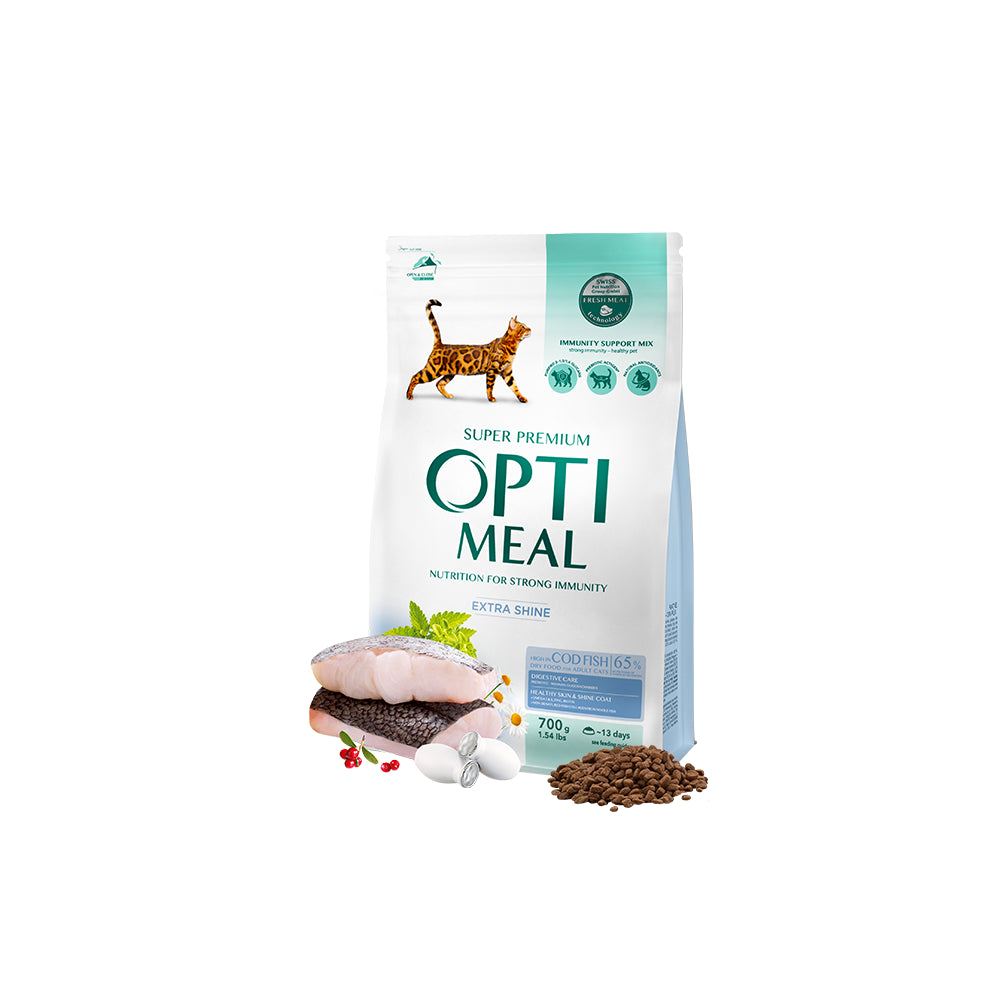dorsz 14 %, odwodnione białko indyka, co najmniej 11 %, odwodnione białko kurczaka, co najmniej 11 %, ryż, jęczmień, kukurydza, gluten kukurydziany, tłuszcz z kurczaka, minerały, hydrolizowane białko zwierzęce 2,0 %, wątróbka z kurczaka w proszku, siemię lniane 1,7 %, drożdże piwne, miąższ buraka, olej z łososia, hydrolizowane białko rybie 1 %, proszek jajeczny, żurawina 0,2 %, olej z ogórecznika, beta-1,3/1,6-glukany 0,05 %, Actigen (źródło prebiotyk-mannanooligosacharydów) 0,04 %, nagietek (źródło luteiny) 0,04 %, korzeń łopianu, korzeń prawoślazu, kwiat rumianku 0,03 %, pokrzywa 0,03 %, tymianek 0,015 %.