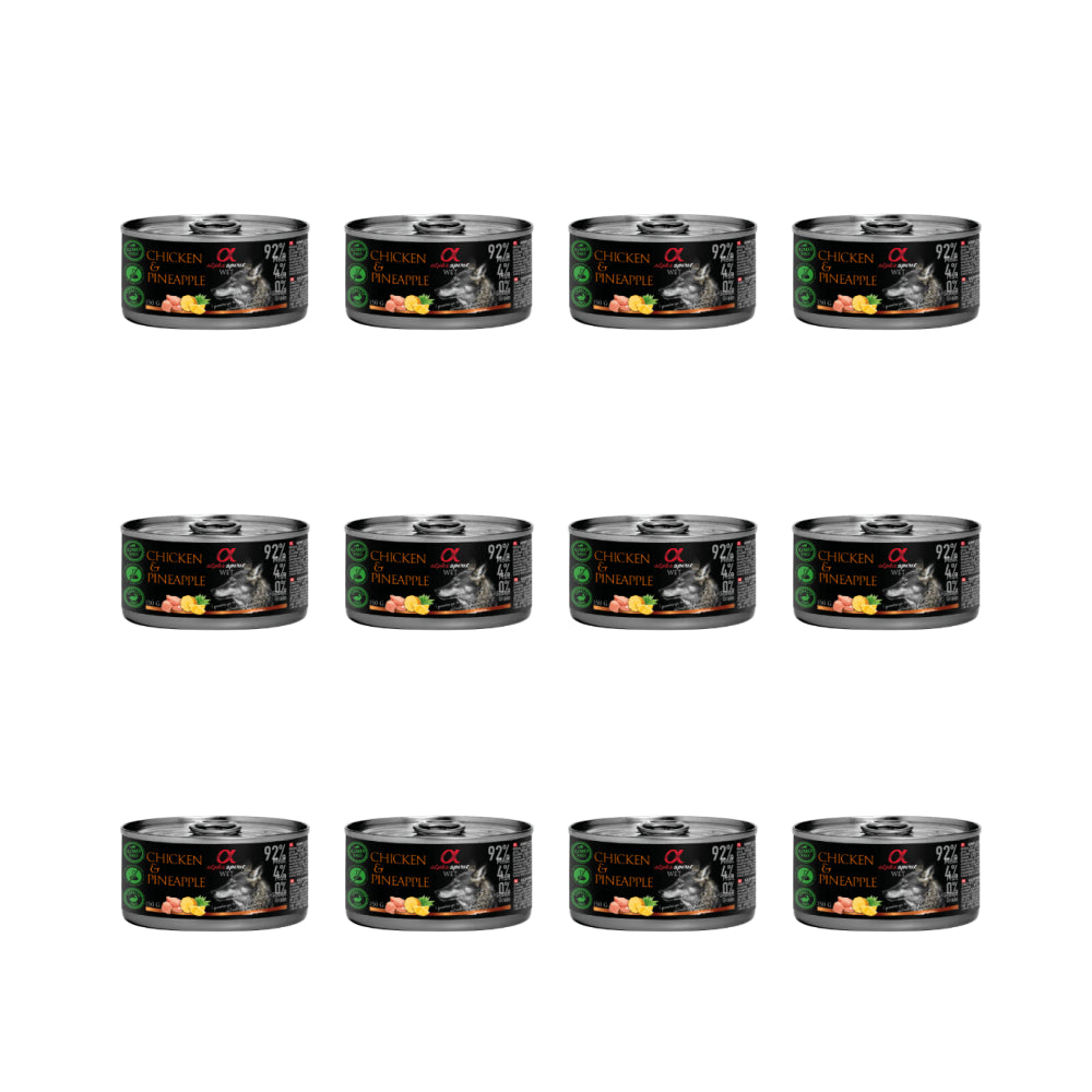 mięso kurczaka 92% (mięso z mięśni 60%, wątróbka 17%, serca 15%), ananas 4%, minerały