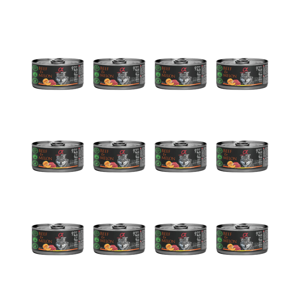 mięso wołowe 92% (mięso z mięśni 60%, wątróbka 12%, płuca 10%, serca 10%), melon 4%, minerały