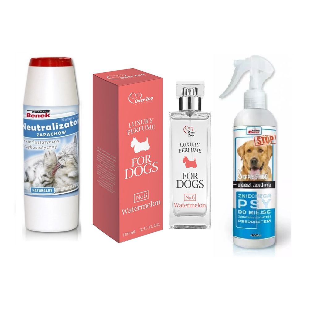 Nauka czystości nie należy do najłatwiejszych zadań, ale z naszym nowym pakietem szybko z tym sobie poradzisz! Benek Akyszek Stop Dog Strong zniechęci Twojego psa przed pozostawianiem nieprzyjemnych śladów i zapachów w wyznaczonych miejscach. Jeśli mimo wszystko zdarzy mu się jakaś wpadka, Neutralizator Zapachu szybko pochłonie odór i oczyści atmosferę, a Perfumy o arbuzowym zapachu sprawią, że Twój pies będzie pachniał świeżo i przyjemnie.