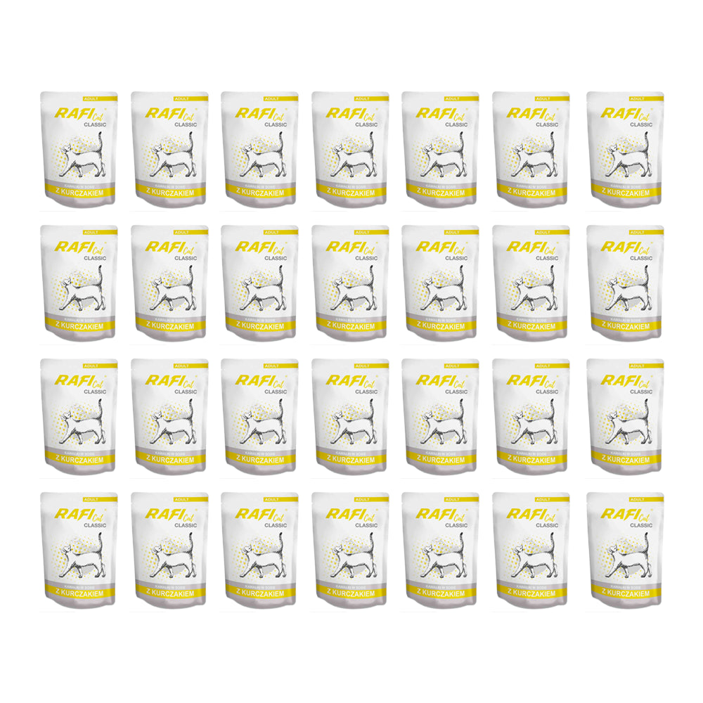 Koty to wybredne, ale urocze i wyjątkowe zwierzęta. By sprostać ich wymaganiom i gustom powstała pełnoporcjowa karma Rafi Cat z kurczakiem. Dzięki dostosowaniu jej składu do nowoczesnych zaleceń żywieniowych, zaspokaja ona wszystkie zapotrzebowania kotów na składniki odżywcze. Pyszne kawałki kurczaka w sosie pozwalają uzupełnić płyny w diecie kota, a aż 82% zawartość mięsa i produktów pochodzenia zwierzęcego sprawia, że dostarcza ona wysokojakościowych białek, tłuszczów i aminokwasów. Ponadto, znajdująca się w niej biotyna wspomaga zdrowie skóry oraz sierści czworonoga, a inulina wspiera układ pokarmowy. Ogromym jej atutem jest rezygnacja z użycia sztucznych barwników i aromatów.