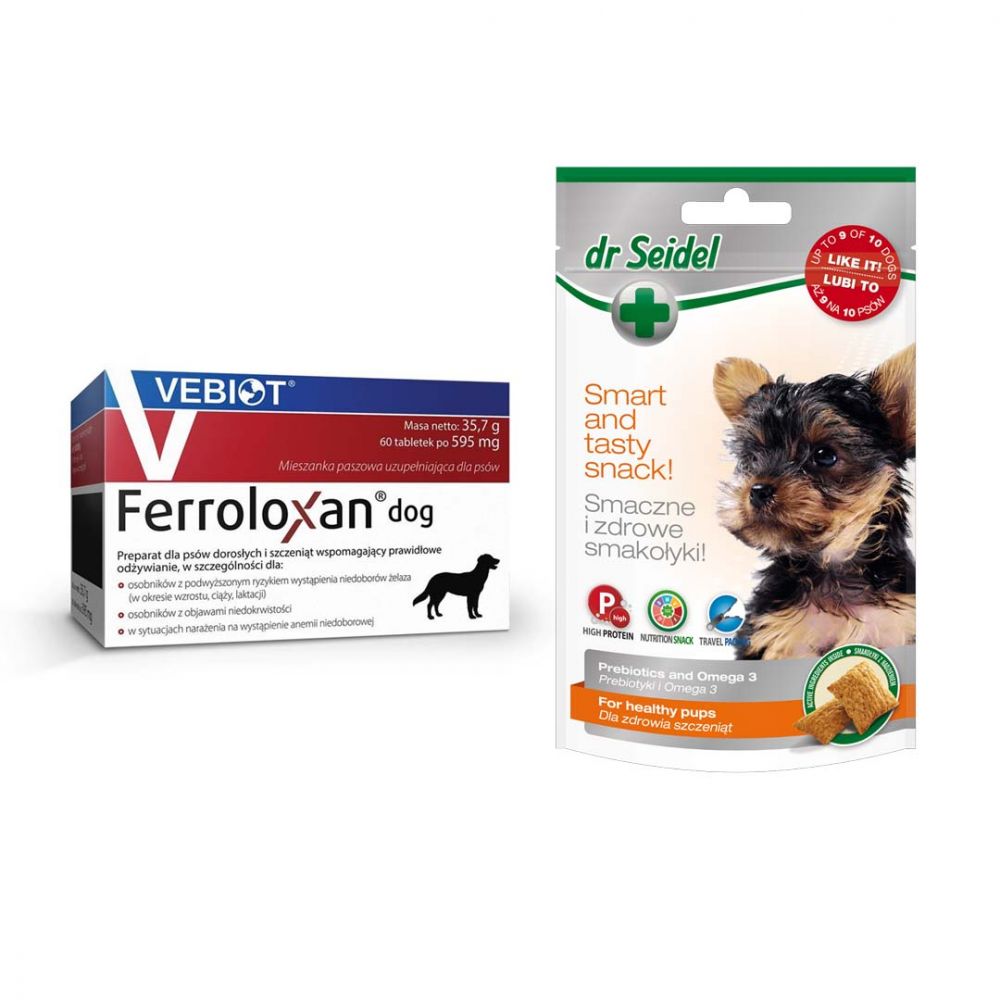 Pakiet Ferroloxan Dog Mieszanka Paszowa Dla Szczeniąt i Psów Dorosłych Z Podwyższonym Ryzykiem Wystąpienia Niedoboru Żelaza 60 Tabletek + Dr Seidel Smakołyki Zdrowie Szczeniąt 90 g GRATIS!