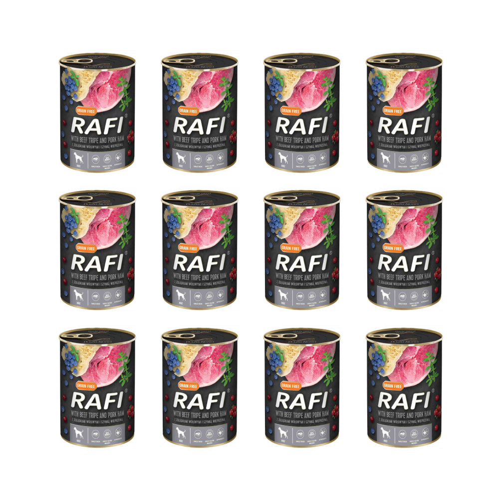 RAFI MOKRA KARMA DLA PSA ŻOŁĄDKI WOŁOWE, SZYNKA, BORÓWKA, ŻURAWINA 12 x 400 g