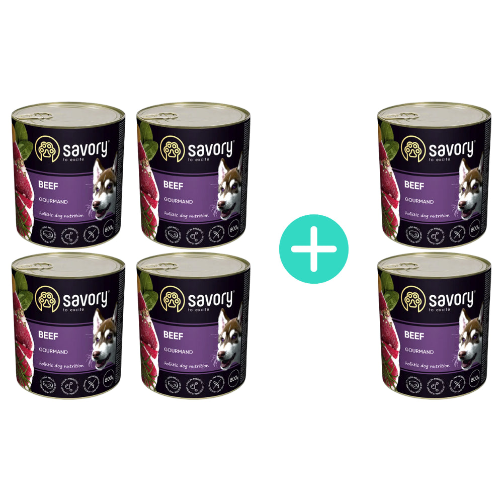 Pakiet Savory Dog Adult Mono Beef Karma Mokra Monoproteinowa Dla Dorosłych Psów Wszystkich Ras z Wołowiną 4 x 800 g + 2 Puszki Gratis!