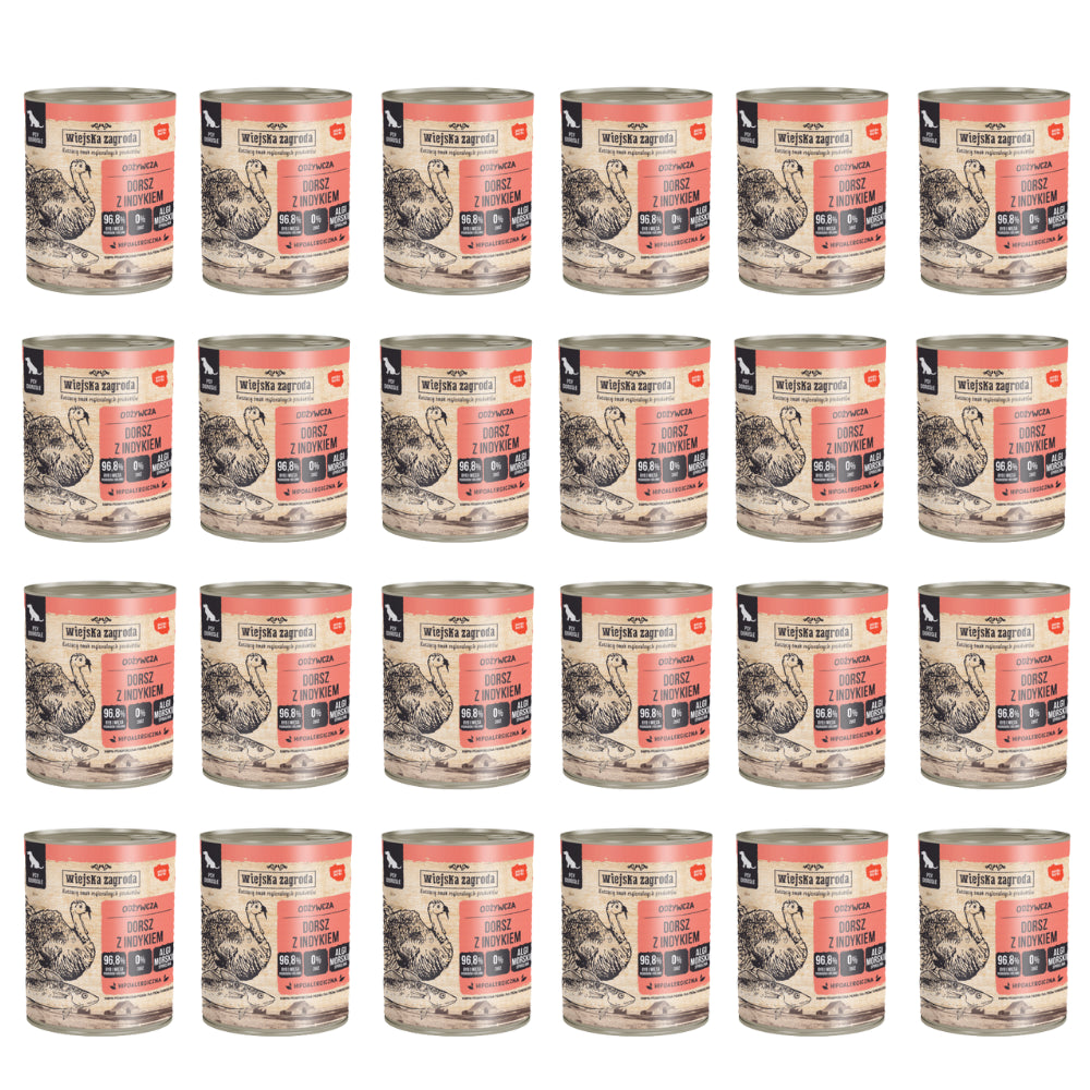 Skład: 35 % dorsz, 35 % indyk (25 % mięso, 10 % wątroba), 2 % marchew, 26,8 % bulion z dorsza i indyka, 1 % składniki mineralne, 0,1 % olej z łososia, 0,1 % spirulina