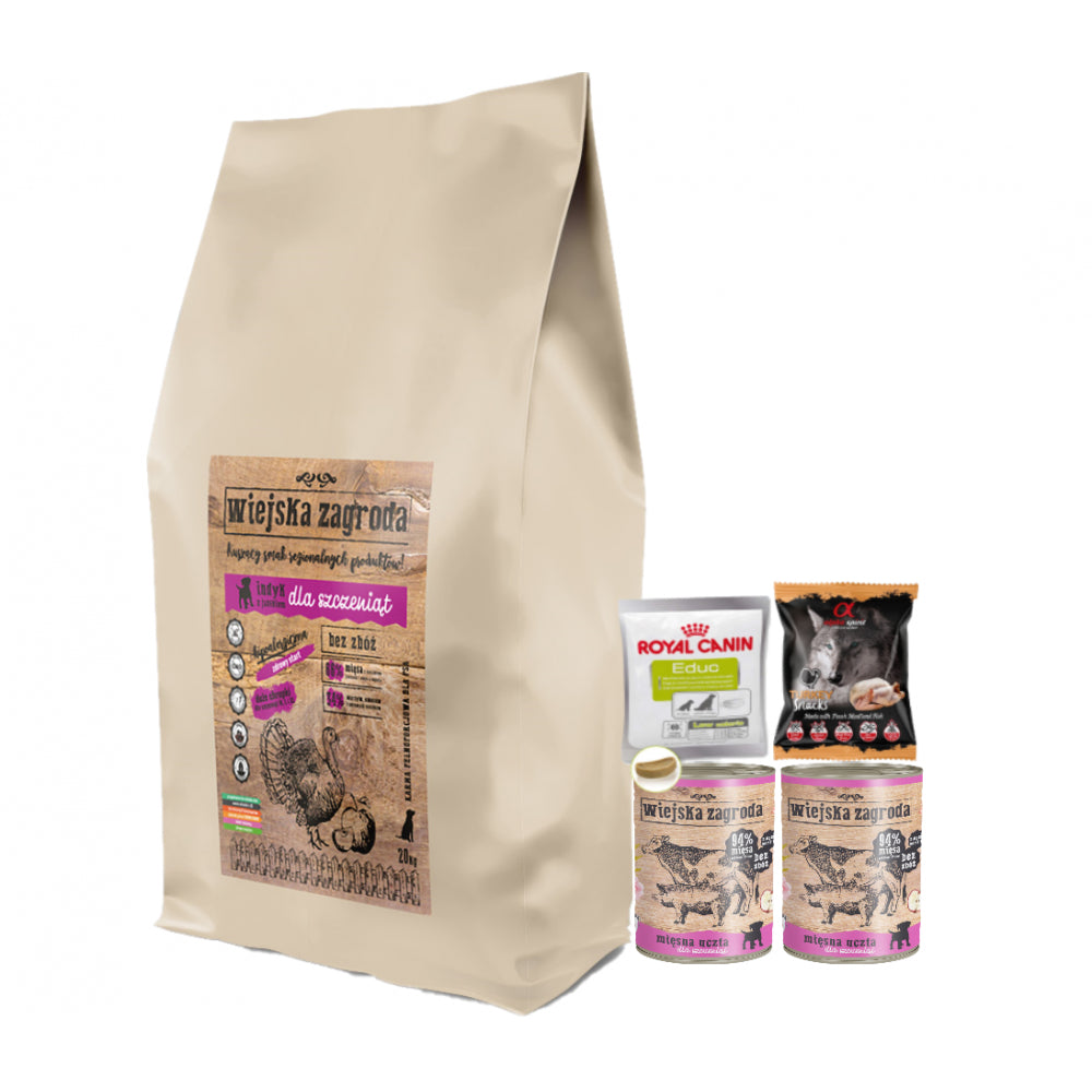 Pakiet Wiejska Zagroda Indyk z Jabłkiem dla Szczeniąt Dużych Ras 20 kg + 4 GRATISY!