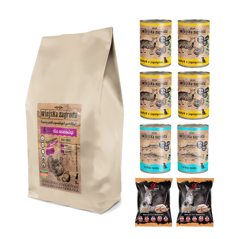 Pakiet Wiejska Zagroda Indyk z Jabłkiem dla Szczeniąt Dużych Ras 20 kg + 8 GRATISÓW