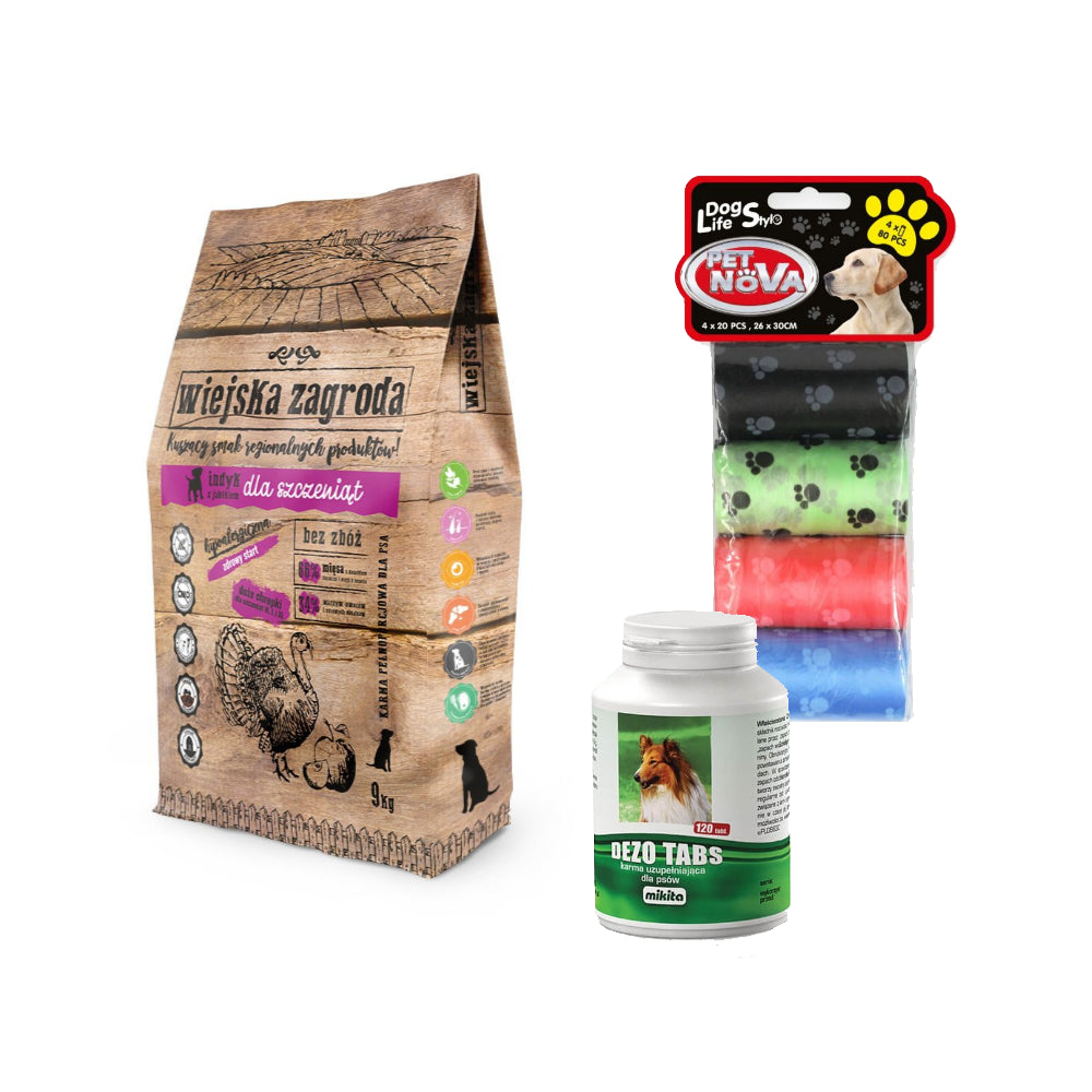 Pakiet Wiejska Zagroda Indyk z Jabłkiem dla Szczeniąt Dużych Ras 9 kg + 2 GRATISY – Dezo Tabs, Kolorowe Worki