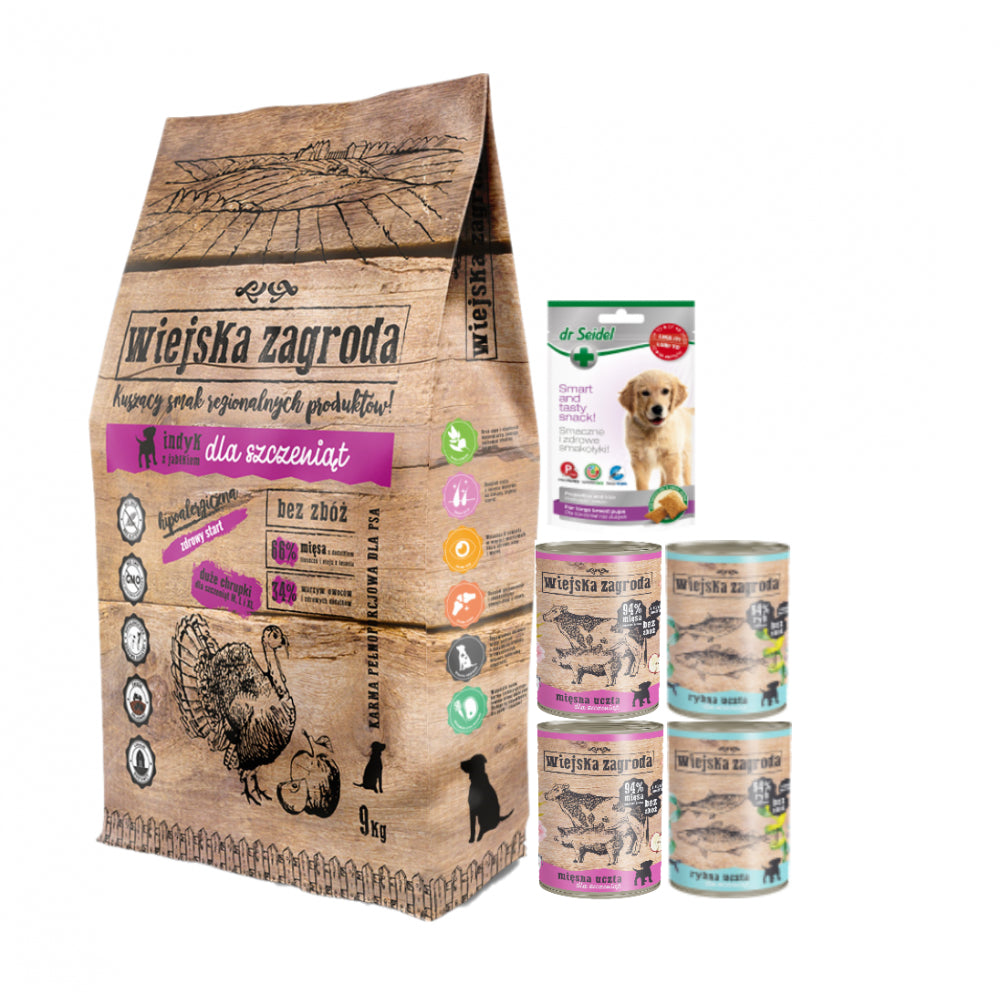 Pakiet Wiejska Zagroda Indyk z Jabłkiem dla Szczeniąt Dużych Ras 9 kg + 5 GRATISÓW!