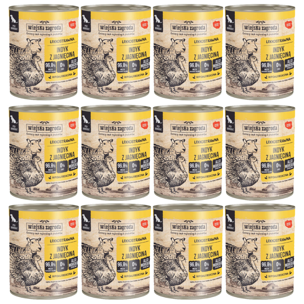 Skład: 44 % indyk (12 % mięso, 12 % szyjki, 12 % wątroba, 8 % żołądki), 26 % jagnięcina (10 % mięso, 10 % żwacze, 6 % podroby), 26,8 % bulion z indyka i jagnięciny, 2 % ziemniaki, 1 % składniki mineralne, 0,1 % olej z łososia, 0,1 % spirulina.
