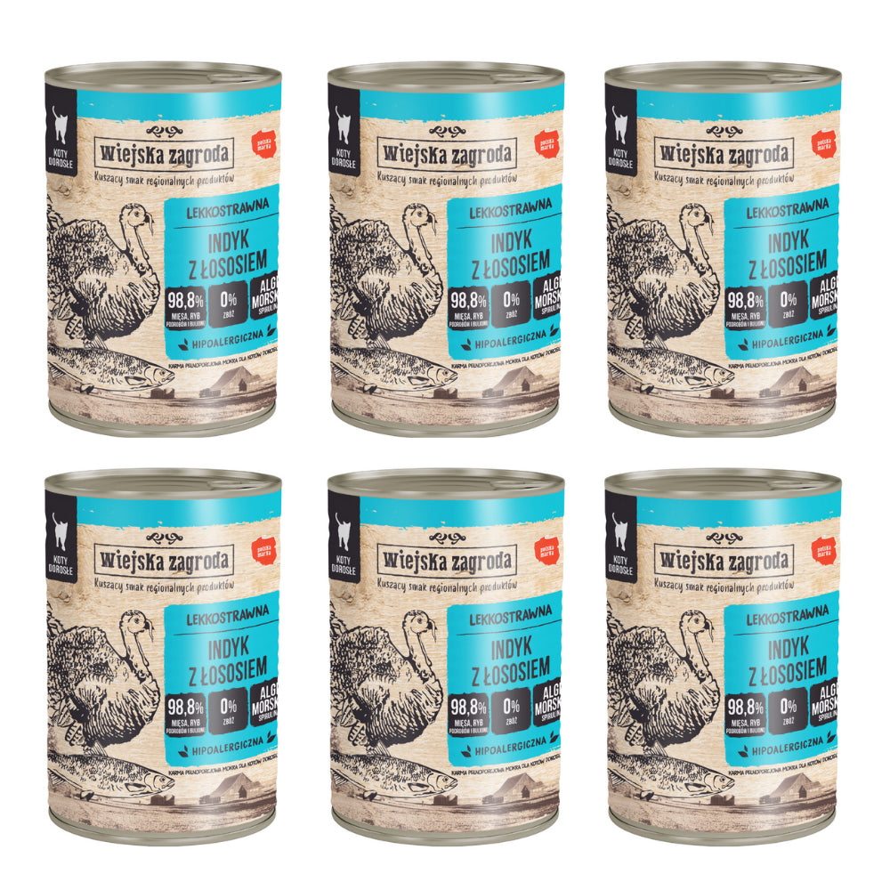 Skład: 44 % indyk (12 % mięso, 12 % wątroba, 10 % serca, 10 % żołądki), 28,8 % bulion z indyka i łososia, 26 % łosoś, 1 % składniki mineralne, 0,1 % olej z łososia, 0,1 % spirulina.