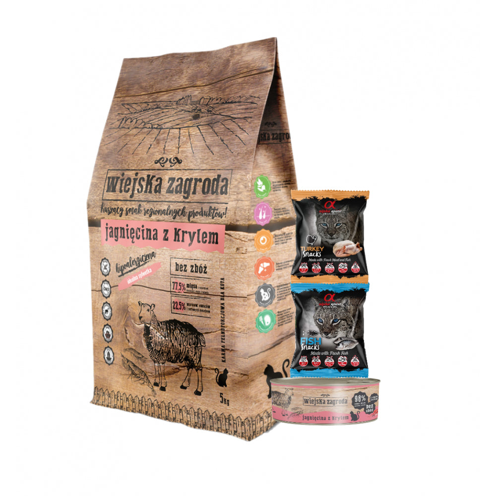 Suszone mięso kurczaka (36%), świeże mięso jagnięce (26%), suszone płatki ziemniaków, groszek, hydrolizowane białko drobiowe (5%), suszony kryl antarktyczny (4%), tłuszcz kurczaka (4%), hydrolizowana wątróbka kurczaka (1,5%), pulpa buraczana, świeży olej z łososia (1%), suszona cykoria (naturalne źródło FOS i inuliny), suszone drożdże browarnicze, minerały, suszone brokuły, suszone pomidory, suszony szpinak, glukozamina, chondroityna, suszona żurawina, suszone jagody, wyciągi roślinne (rozmaryn, winorośl, kurkuma, cytrusy, goździkowiec, Yucca Schidigera), antyoksydanty.