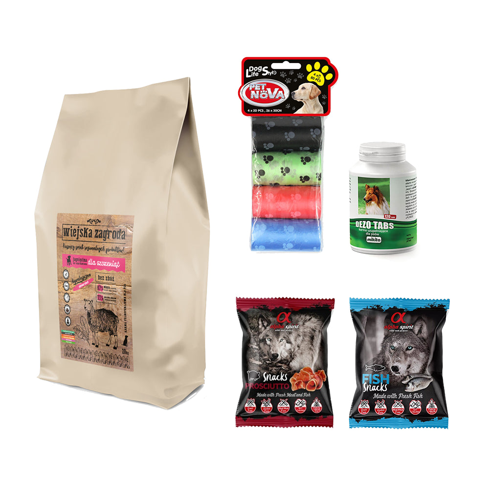 Pakiet Wiejska Zagroda Jagnięcina ze Szpinakiem dla Szczeniąt 20 kg + 4 GRATISY - Dezo Tabs, Kolorowe Woreczki, Przysmak