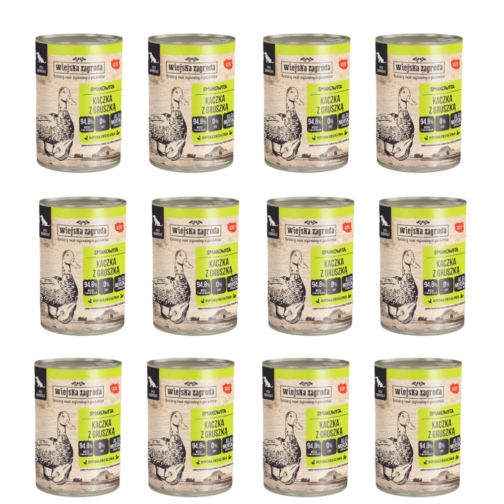 Skład: 50 % kaczka (21 % mięso, 19 % szyjki, 5 % wątroba, 5 % serca), 20 % indyk (8 % mięso, 8 % wątroba, 4 % żołądki), 24,8 % bulion z kaczki i indyka, 4 % gruszki, 1 % składniki mineralne, 0,1 % olej z łososia, 0,1 % spirulina.