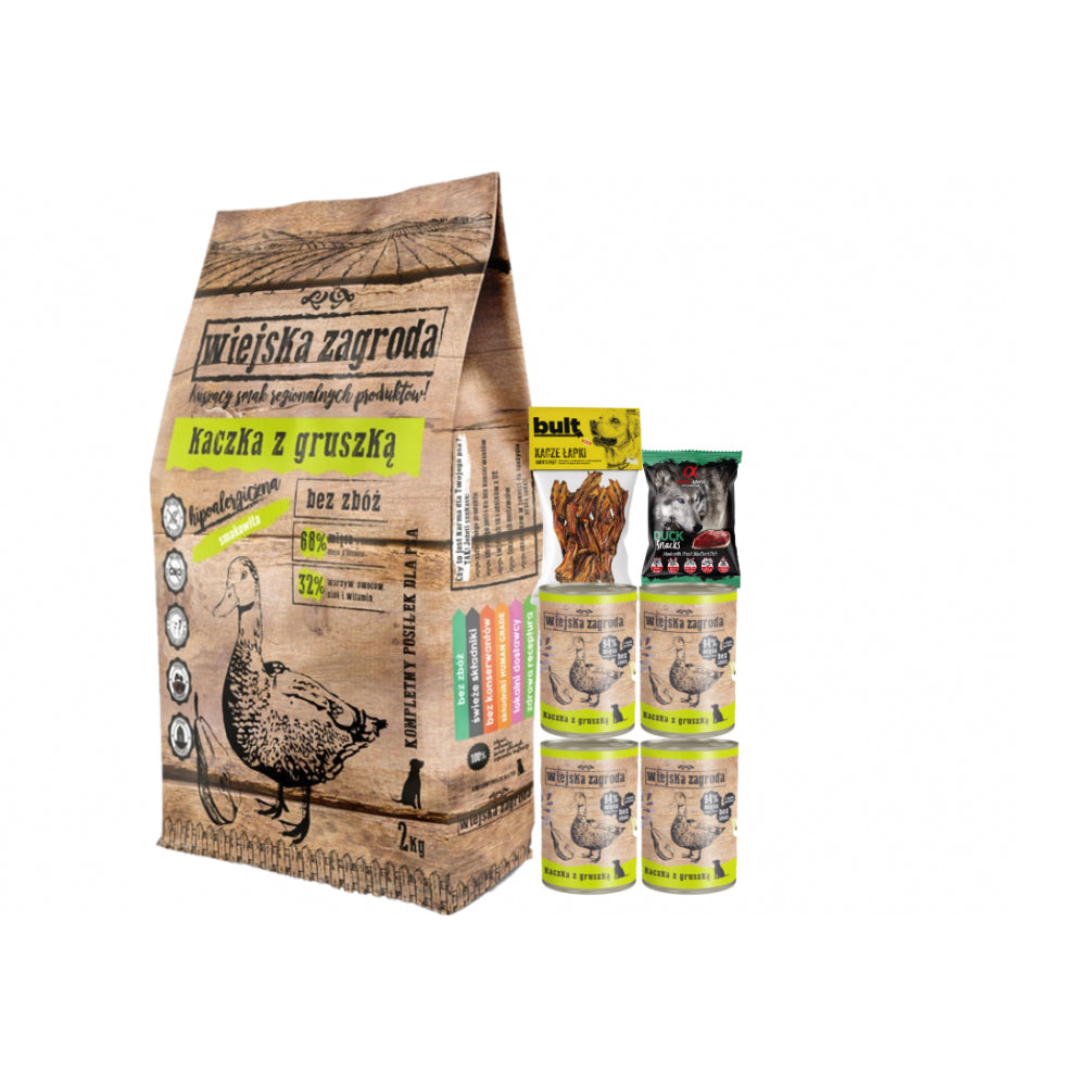 Psy to prawdziwi mięsożercy. Ostatnie dyskusje i badania na temat ich diety dowodziły, że przystosowane są do jedzenia również warzyw, owoców i roślin, jednak to mięso zawsze pełniło rolę ich podstawowego pożywienia. Właściwe dlatego ich dieta powinna składać się głównie z mięsa, zapewniającego im energię i białko niezbędne dla budowy i funkcjonowania mięśni. Pełnoporcjowa karma sucha Wiejska Zagroda Kaczka z Gruszką została stworzona z myślą o wszystkich psach i zaspokojeniu ich zapotrzebowania na mięso. Jej prosty skład pozbawiony jest zbóż, sztucznych konserwantów i wypełniaczy, dzięki czemu jest znacznie zdrowsza niż wiele innych dostępnych na rynku karm. Ponadto, składa się ona w aż 68% z mięsa z dodatkiem oleju z łososia, które wzbogacone są warzywami, owocami oraz ziołami. Dzięki takiemu doborowi składników, zapewnia ona psu wszystkie niezbędne wartości odżywcze, witaminy oraz minerały.