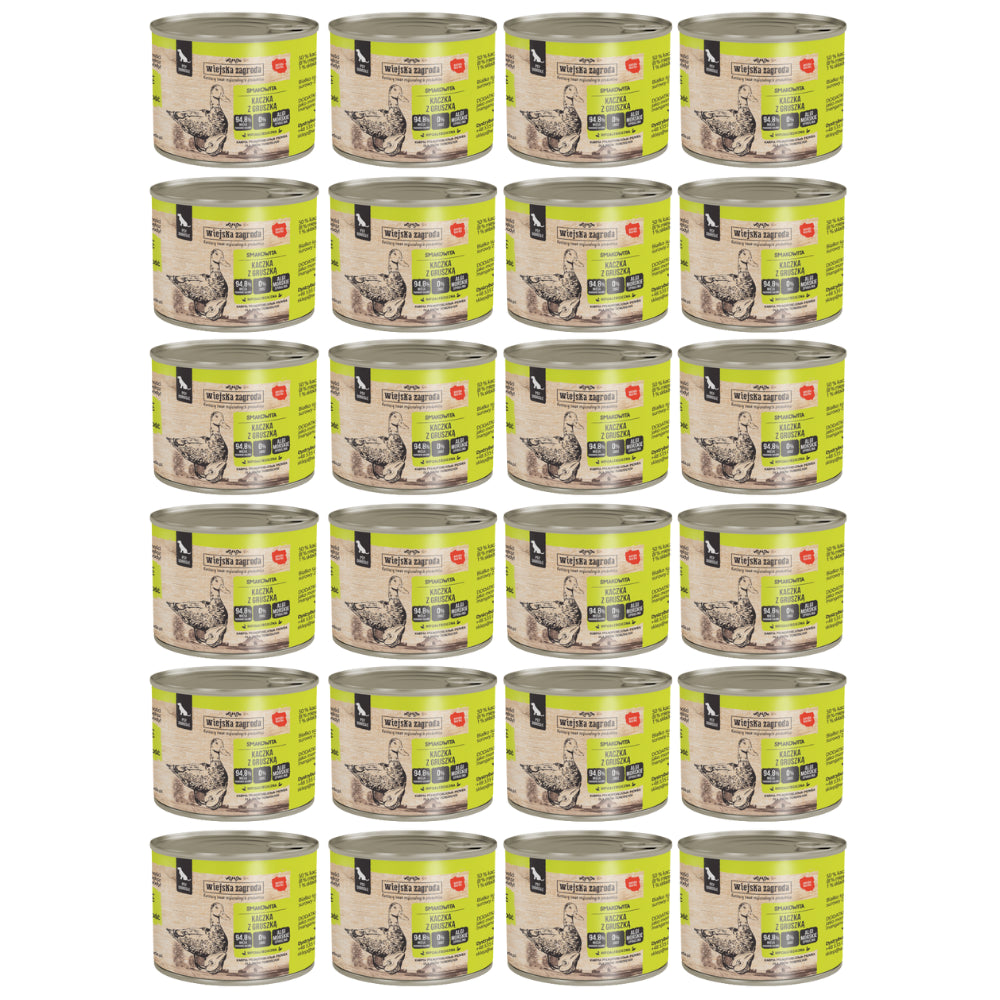 Skład: 50 % kaczka (21 % mięso, 19 % szyjki, 5 % wątroba, 5 % serca), 20 % indyk (8 % mięso, 8 % wątroba, 4 % żołądki), 24,8 % bulion z kaczki i indyka, 4 % gruszki, 1 % składniki mineralne, 0,1 % olej z łososia, 0,1 % spirulina.