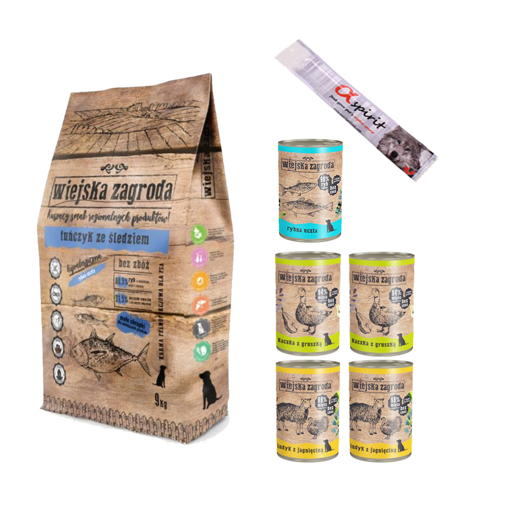Pakiet Wiejska Zagroda Karma Tuńczyk ze Śledziem 9 kg + 6 GRATISÓW
