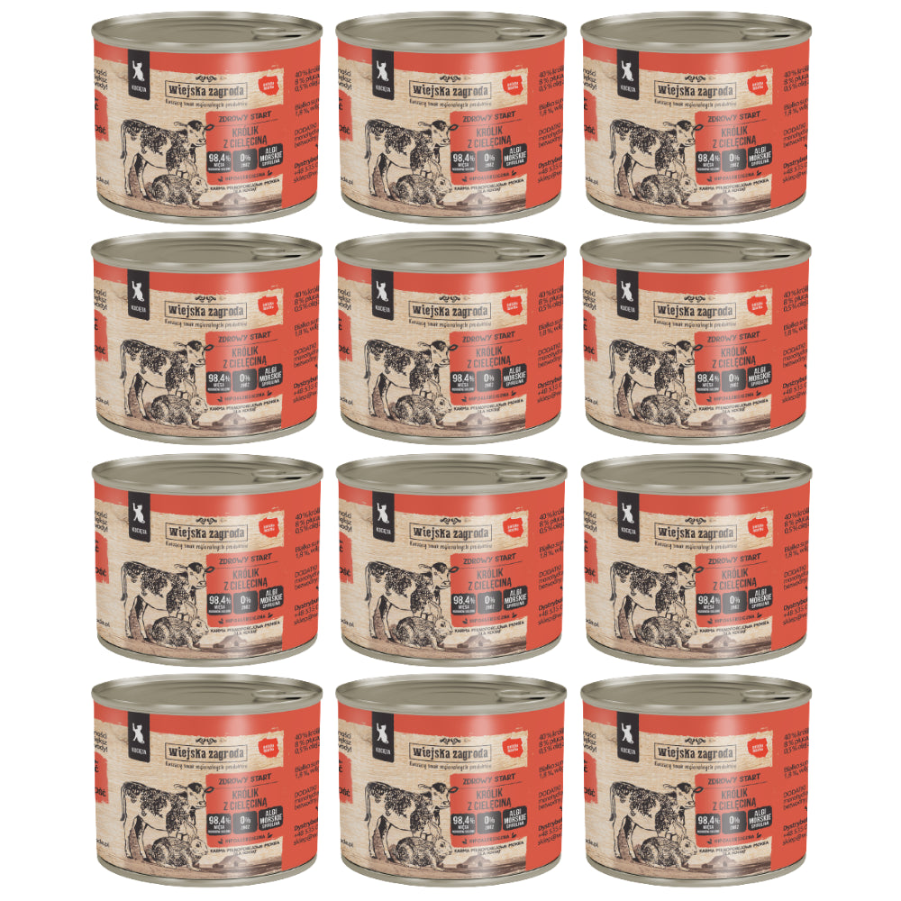 Skład: 40 % królik (22 % mięso, 18 % podroby), 30 % cielęcina (9 % mięso, 8 % wątroba, 8 % płuca, 5 % serca), 28,4 % bulion z królika i cielęciny, 1 % składniki mineralne, 0,5 % olej z łososia, 0,1 % spirulina.