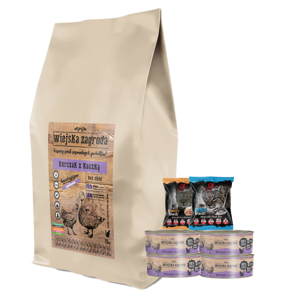 Mięso kurczaka (50%, w tym 30% suszone mięso kurczaka, 20% świeże mięso kurczaka), groszek łuskany, groszek, tłuszcz kurczaka (8,2%), suszone mięso drobiowe (6%), hydrolizowane białko drobiowe (5%), suszone mięso kaczki (4%), pulpa buraczana, hydrolizowana wątróbka kurczaka (1,5%), świeży olej #z łososia (1%), minerały, suszone drożdże browarnicze, celuloza, suszona cykoria (naturalne źródło FOS i inuliny), suszone brokuły, suszone pomidory, suszony szpinak, glukozamina, chondroityna, suszona żurawina, suszone jagody, wyciągi roślinne (rozmaryn, winorośl, kurkuma, cytrusy, goździkowiec, Yucca Schidigera), antyoksydanty.