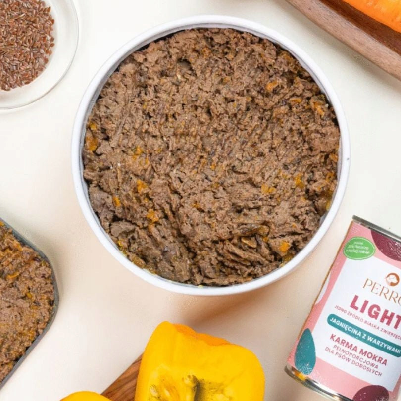PERRO Karma mokra Jagnięcina z warzywami – karma mokra light dla psa Linia karm mokrych PERRO Light to linia dedykowana psom z wrażliwym układem trawiennym, psim seniorom oraz wszystkim tym psom, które chcą zgubić nadprogramowe kilogramy.