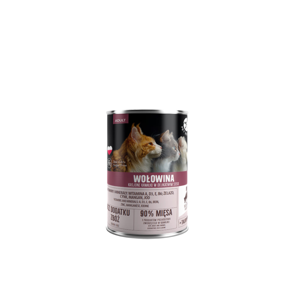 Krojone kawałki wołowiny dla kotów wszystkich ras, serwowane w delikatnym sosie stanowiącym zaproszenie do pysznego posiłku. 90% mięsa i produktów pochodzenia zwierzęcego w kawałku!