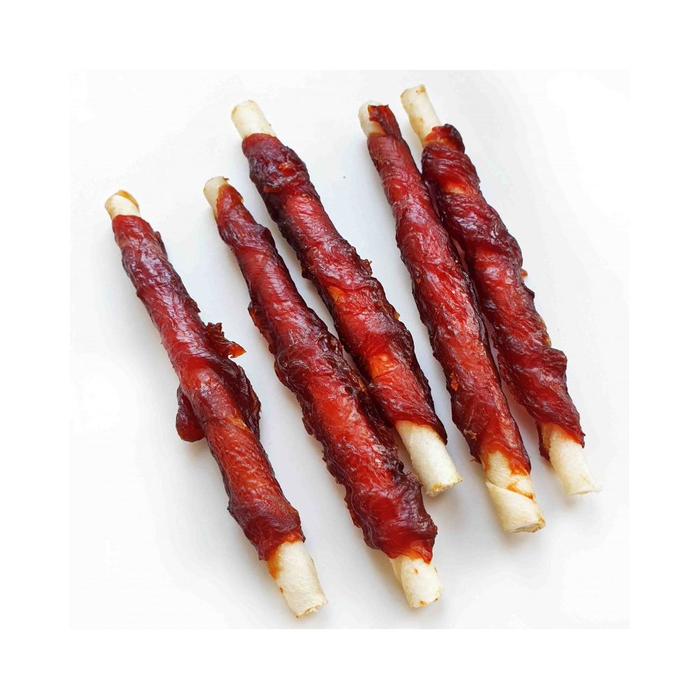 Soczyste mięso z kaczki owinięte wokół białego patyczka ze skóry - idealna przekąska zaspokajające naturalną potrzebę żucia i gryzienia każdego psa.