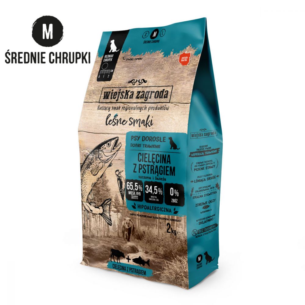Skład: Cielęcina (44 %, w tym 34 % suszona cielęcina, 10 % świeża cielęcina), tłuszcz wołowy (12 %), bataty, płatki ziemniaczane suszone, hydrolizowana wątroba wieprzowa (5 %), suszony pstrąg (4 %), suszone wysłodki buraczane (z buraków cukrowych), siemię lniane, składniki mineralne, suszone drożdże piwne (0,5 %), suszona cykoria, MOS (manno-oligosacharydy), olej z łososia (0,5 %), suszony rumianek (0,5 %), suszone brokuły, suszone pomidory, suszony szpinak, suszone borówki, ekstrakty roślinne (Jukka Mojave, rozmaryn, kurkuma, cytrusy, goździkowiec), glukozamina, siarczan chondroityny.